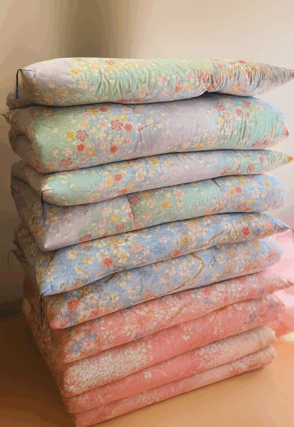 お待たせいたしました。この時期たくさんのお打ち直しのご注文をいただいております。 おふとんは仕立て上がりましたら、2~3日おいて中の綿を落ち着かせます。 こちらはお客様のお手元に届くまで、綿を落ち着かせている状況です。